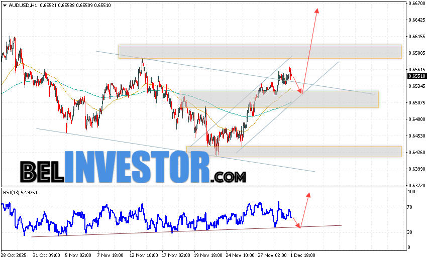 Австралийский Доллар Прогноз AUD/USD на 2 декабря 2025 предполагает попытку теста уровня поддержки вблизи области 0.6525. Далее, продолжение роста котировок пары выше уровня 0.6645. Дополнительным сигналом в пользу подъёма пары выступит отбой от линии тренда на индикаторе относительной силы. Отменой варианта с ростом станет падение котировок AUD/USD и пробой области 0.6475. Это укажет на продолжение падения котировок с потенциальной целью ниже уровня 0.6325.