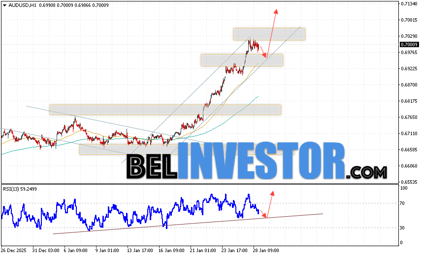 Австралийский Доллар Прогноз AUD/USD на 29 января 2026 предполагает попытку теста уровня поддержки вблизи области 0.6965. Далее, продолжение роста котировок пары выше уровня 0.7165. Дополнительным сигналом в пользу подъёма пары выступит отбой от линии тренда на индикаторе относительной силы. Отменой варианта с ростом станет падение котировок AUD/USD и пробой области 0.6895. Это укажет на продолжение снижения котировок с потенциальной целью ниже уровня 0.6725.