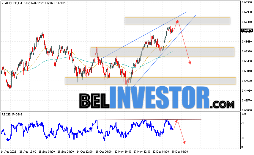 Австралийский Доллар Прогноз AUD/USD на 31 декабря 2025 предполагает попытку теста уровня сопротивления вблизи области 0.6755. Далее, продолжение падения котировок пары выше уровня 0.6535. Дополнительным сигналом в пользу снижения пары выступит отбой от линии тренда на индикаторе относительной силы. Отменой варианта с падением станет сильный рост котировок AUD/USD и пробой области 0.6795. Это укажет на продолжение подъёма котировок с потенциальной целью выше уровня 0.6975.
