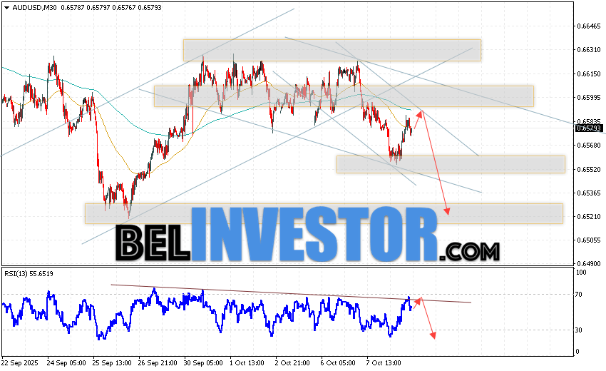 Австралийский Доллар Прогноз AUD/USD на 9 октября 2025 предполагает попытку теста уровня сопротивления вблизи области 0.6605. Далее, продолжение падения котировок пары ниже уровня 0.6525. Дополнительным сигналом в пользу снижения пары выступит отбой от линии тренда на индикаторе относительной силы. Отменой варианта с падением станет сильный рост котировок AUD/USD и пробой области 0.6605. Это укажет на продолжение роста котировок с потенциальной целью выше уровня 0.6785.