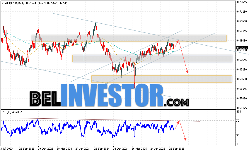 Дополнительным сигналом в пользу падения пары на Форекс выступит отскок от верхней границы нисходящего канала. Вторым сигналом станет отскок от линии сопротивления на индикаторе относительной силы (RSI). Отменой варианта падения валютной пары AUD/USD на текущей торговой неделе 13 — 17 октября 2025 станет сильный рост и пробой уровня 0.6825. Это укажет на пробой уровня сопротивления и продолжение роста Австралийского Доллара на Форекс с потенциальной целью на уровне 0.7205. Подтверждением развития падения выступит пробой области поддержки и закрытие цен ниже уровня 0.6365, что укажет на пробой нижней границы бычьего канала коррекции.