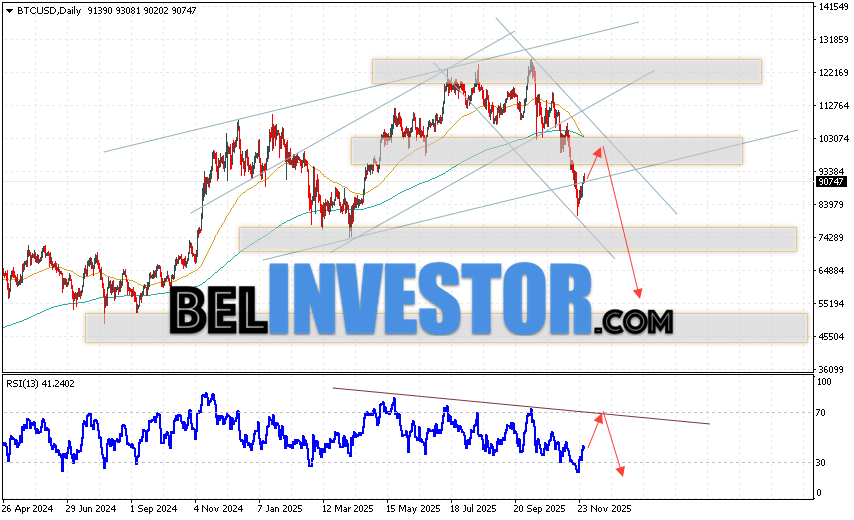 Дополнительным сигналом в пользу падения котировок BTC/USD на текущей торговой неделе 1 — 5 декабря 2025 выступит отскок от нижней границы бычьего канала. Вторым сигналом станет отскок от линии сопротивления на индикаторе относительной силы (RSI). Отменой варианта падения Bitcoin на текущей торговой неделе станет сильный рост и пробой области 105605. Это укажет на пробой области сопротивления и продолжение роста котировок BTC/USD с потенциальной целью выше уровня 120055. Подтверждением развития медвежьего движения выступит пробой области поддержки и закрытие котировок ниже уровня 80005.