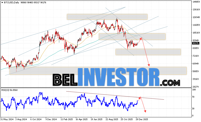 Дополнительным сигналом в пользу падения котировок BTC/USD на текущей торговой неделе 5 — 9 января 2026 выступит отскок от нижней границы бычьего канала. Вторым сигналом станет отскок от линии сопротивления на индикаторе относительной силы (RSI). Отменой варианта падения Bitcoin на текущей торговой неделе станет сильный рост и пробой области 106505. Это укажет на пробой области сопротивления и продолжение роста котировок BTC/USD с потенциальной целью выше уровня 115065. Подтверждением развития медвежьего движения выступит пробой области поддержки и закрытие котировок ниже уровня 81565.
