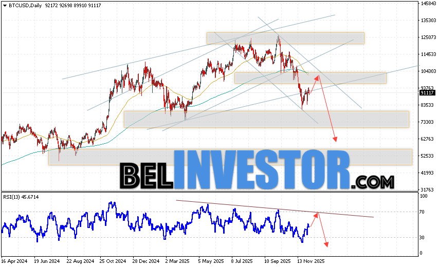 Дополнительным сигналом в пользу падения котировок BTC/USD на текущей торговой неделе 8 — 12 декабря 2025 выступит отскок от нижней границы бычьего канала. Вторым сигналом станет отскок от линии сопротивления на индикаторе относительной силы (RSI). Отменой варианта падения Bitcoin на текущей торговой неделе станет сильный рост и пробой области 105605. Это укажет на пробой области сопротивления и продолжение роста котировок BTC/USD с потенциальной целью выше уровня 120055. Подтверждением развития медвежьего движения выступит пробой области поддержки и закрытие котировок ниже уровня 80005.