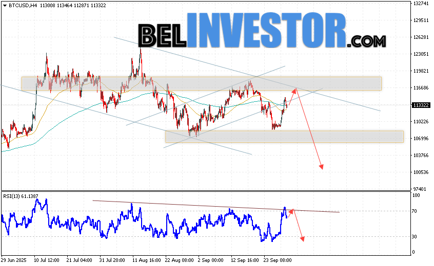 Котировки BTC/USD торгуются на уровне 113322 и продолжают движение в рамках развития падения и нисходящего канала. Скользящие средние указывают на наличие краткосрочной нисходящей тенденции по Bitcoin. Цены пробили область между сигнальными линиями вверх, что указывает на давление со стороны покупателей «Цифрового Золота» и потенциальное продолжение развития роста стоимости актива уже с текущих уровней. В рамках прогноза курса криптовалюты на завтра 1 октября 2025 стоит ожидать попытку развития подъёма стоимости цифрового актива и тест уровня сопротивления вблизи области 116655. Откуда вновь стоит ожидать отскок вниз и попытку продолжения падения курса Bitcoin с целью ниже области 100545.