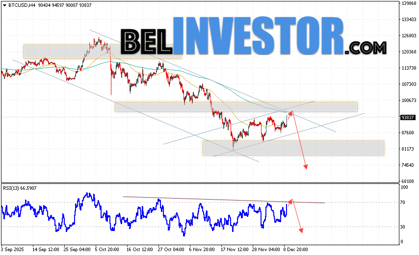 Котировки BTC/USD торгуются на уровне 93837 и продолжают движение в рамках развития коррекции и нисходящего канала. Скользящие средние указывают на наличие краткосрочной медвежьей тенденции по Bitcoin. Цены вновь тестируют область между сигнальными линиями, что указывает на давление со стороны продавцов «Цифрового Золота» и потенциальное продолжение развития падения стоимости актива уже с текущих уровней. В рамках прогноза курса криптовалюты на завтра 10 декабря 2025 стоит ожидать попытку развития бычьей коррекции стоимости цифрового актива и тест уровня сопротивления вблизи области 95205. Откуда вновь стоит ожидать отскок вниз и попытку продолжения падения курса Bitcoin с целью ниже области 73505.