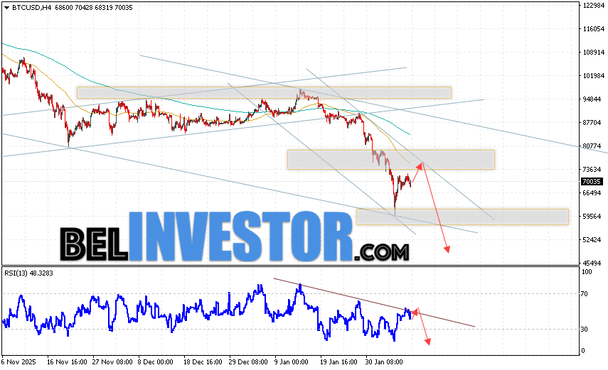 Котировки BTC/USD торгуются на уровне 70035 и продолжают движение в рамках развития коррекции и нисходящего канала. Скользящие средние указывают на наличие краткосрочной медвежьей тенденции по Bitcoin. Цены пробили область между сигнальными линиями вниз, что указывает на давление со стороны продавцов «Цифрового Золота» и потенциальное продолжение развития падения стоимости актива уже с текущих уровней. В рамках прогноза курса криптовалюты на завтра 10 февраля 2026 стоит ожидать попытку развития бычьей коррекции стоимости цифрового актива и тест уровня сопротивления вблизи области 73765. Откуда вновь стоит ожидать отскок вниз и попытку продолжения падения курса Bitcoin с целью ниже области 51505.