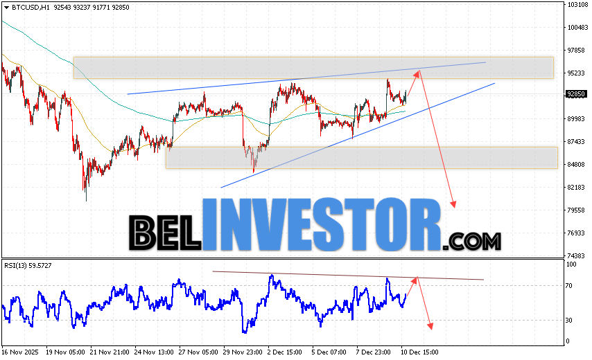Котировки BTC/USD торгуются на уровне 92850 и продолжают движение в рамках развития коррекции и формирования разворотной модели
