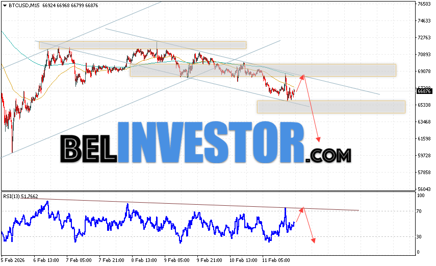 Котировки BTC/USD торгуются на уровне 66876 и продолжают движение в рамках развития падения и нисходящего канала. Скользящие средние указывают на наличие краткосрочной медвежьей тенденции по Bitcoin. Цены пробили область между сигнальными линиями вниз, что указывает на давление со стороны продавцов «Цифрового Золота» и потенциальное продолжение развития падения стоимости актива уже с текущих уровней. В рамках прогноза курса криптовалюты на завтра 12 февраля 2026 стоит ожидать попытку развития бычьей коррекции стоимости цифрового актива и тест уровня сопротивления вблизи области 69665. Откуда вновь стоит ожидать отскок вниз и попытку продолжения падения курса Bitcoin с целью ниже области 61595.