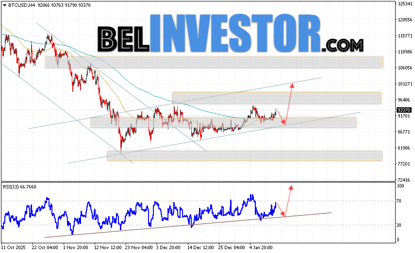 BTC/USD прогноз курса Биткоина на 14 января 2026 предполагает попытку теста уровня поддержки вблизи области 90205. И далее, продолжение роста криптовалюты с потенциальной целью на уровне 101305. Дополнительным сигналом в пользу роста курса Bitcoin выступит тест линии поддержки на индикаторе относительной силы. Отменой варианта роста цифровой валюты станет пробой области 84065. Это укажет на продолжение падения монеты с потенциальной целью ниже отметки 78255.