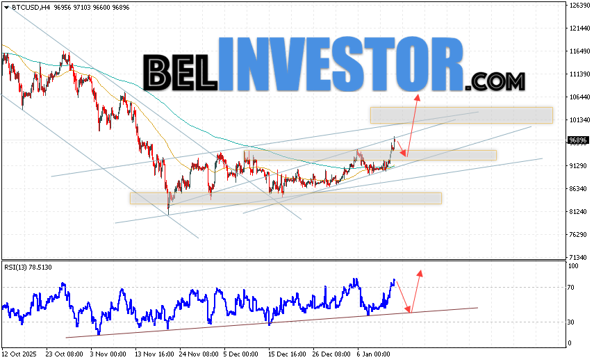 BTC/USD прогноз курса Биткоина на 15 января 2026 предполагает попытку теста уровня поддержки вблизи области 94305. И далее, продолжение роста криптовалюты с потенциальной целью на уровне 106445. Дополнительным сигналом в пользу роста курса Bitcoin выступит тест линии поддержки на индикаторе относительной силы. Отменой варианта роста цифровой валюты станет пробой области 86205. Это укажет на продолжение падения монеты с потенциальной целью ниже отметки 78045.