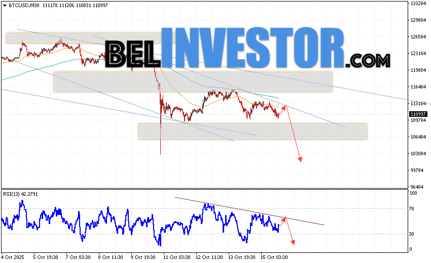 Котировки BTC/USD торгуются на уровне 110997 и продолжают движение в рамках развития падения и нисходящего канала. Скользящие средние указывают на наличие краткосрочной медвежьей тенденции по Bitcoin. Цены вновь тестируют область между сигнальными линиями, что указывает на давление со стороны покупателей «Цифрового Золота» и потенциальное продолжение развития роста стоимости актива уже с текущих уровней. В рамках прогноза курса криптовалюты на завтра 16 октября 2025 стоит ожидать попытку развития роста стоимости цифрового актива и тест уровня сопротивления вблизи области 112405. Откуда вновь стоит ожидать отскок вниз и попытку продолжения падения курса Bitcoin с целью ниже области 102505.