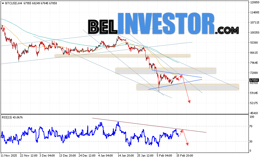 BTC/USD прогноз курса Биткоина на 17 февраля 2026 предполагает попытку теста уровня сопротивления вблизи области 67265. И далее, продолжение падения криптовалюты с потенциальной целью на уровне 60765. Дополнительным сигналом в пользу роста курса Bitcoin выступит тест линии сопротивления на индикаторе относительной силы. Отменой варианта падения цифровой валюты станет пробой области 71065. Это укажет на продолжение подъёма монеты с потенциальной целью выше отметки 76505.