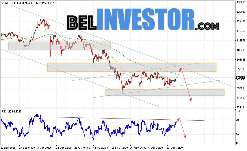 Котировки BTC/USD торгуются на уровне 90097 и продолжают движение в рамках развития коррекции и нисходящего канала. Скользящие средние указывают на наличие краткосрочной медвежьей тенденции по Bitcoin. Цены вновь тестируют область между сигнальными линиями, что указывает на давление со стороны продавцов «Цифрового Золота» и потенциальное продолжение развития падения стоимости актива уже с текущих уровней. В рамках прогноза курса криптовалюты на завтра 23 декабря 2025 стоит ожидать попытку развития бычьей коррекции стоимости цифрового актива и тест уровня сопротивления вблизи области 95205. Откуда вновь стоит ожидать отскок вниз и попытку продолжения падения курса Bitcoin с целью ниже области 75605.