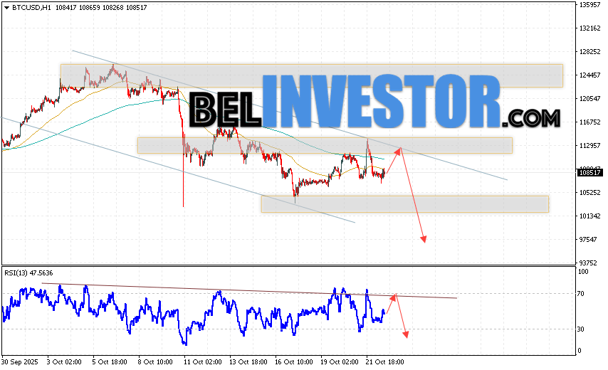 Котировки BTC/USD торгуются на уровне 108517 и продолжают движение в рамках развития падения и нисходящего канала. Скользящие средние указывают на наличие краткосрочной медвежьей тенденции по Bitcoin. Цены пробили область между сигнальными линиями вниз, что указывает на давление со стороны продавцов «Цифрового Золота» и потенциальное продолжение развития снижения стоимости актива уже с текущих уровней. В рамках прогноза курса криптовалюты на завтра 23 октября 2025 стоит ожидать попытку развития бычьей коррекции стоимости цифрового актива и тест уровня сопротивления вблизи области 113505. Откуда вновь стоит ожидать отскок вниз и попытку продолжения падения курса Bitcoin с целью ниже области 97505.
