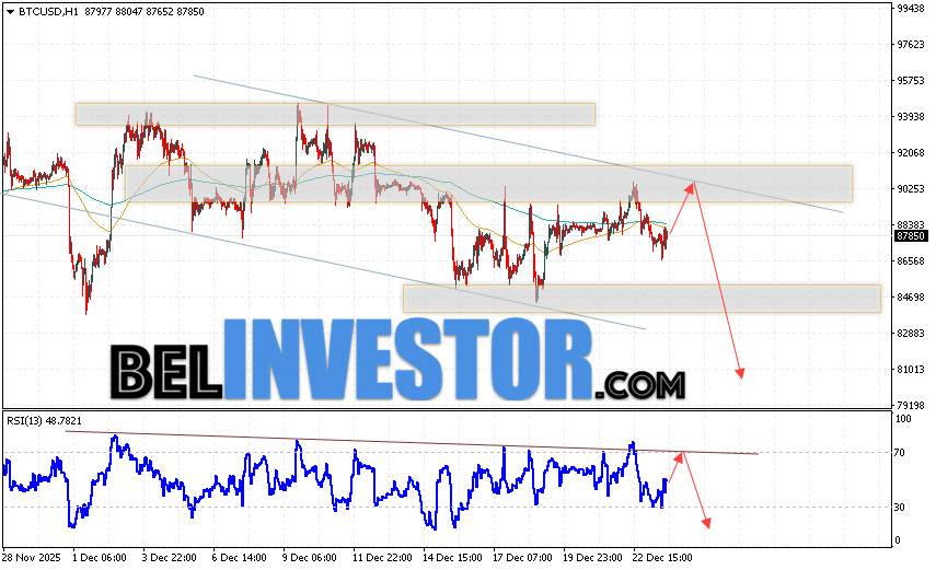 Котировки BTC/USD торгуются на уровне 87850 и продолжают движение в рамках развития коррекции и нисходящего канала. Скользящие средние указывают на наличие краткосрочной медвежьей тенденции по Bitcoin. Цены пробили область между сигнальными линиями вниз, что указывает на давление со стороны продавцов «Цифрового Золота» и потенциальное продолжение развития падения стоимости актива уже с текущих уровней. В рамках прогноза курса криптовалюты на завтра 24 декабря 2025 стоит ожидать попытку развития бычьей коррекции стоимости цифрового актива и тест уровня сопротивления вблизи области 90265. Откуда вновь стоит ожидать отскок вниз и попытку продолжения падения курса Bitcoin с целью ниже области 80705.