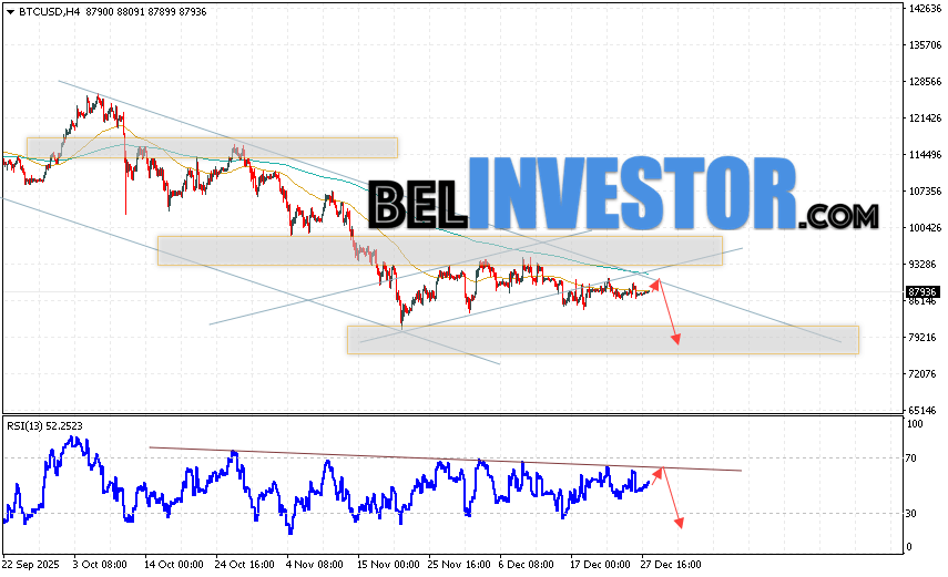 Котировки BTC/USD торгуются на уровне 87936 и продолжают движение в рамках развития коррекции и нисходящего канала. Скользящие средние указывают на наличие краткосрочной медвежьей тенденции по Bitcoin. Цены пробили область между сигнальными линиями вниз, что указывает на давление со стороны продавцов «Цифрового Золота» и потенциальное продолжение развития падения стоимости актива уже с текущих уровней. В рамках прогноза курса криптовалюты на завтра 29 декабря 2025 стоит ожидать попытку развития бычьей коррекции стоимости цифрового актива и тест уровня сопротивления вблизи области 88605. Откуда вновь стоит ожидать отскок вниз и попытку продолжения падения курса Bitcoin с целью ниже области 79405.