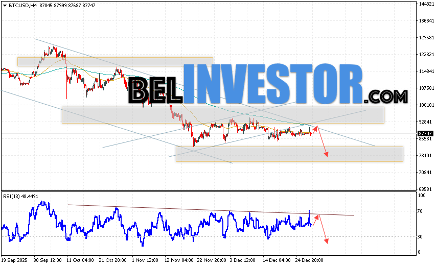 Дополнительным сигналом в пользу падения котировок BTC/USD выступит тест линии сопротивления на индикаторе относительной силы. Вторым сигналом в пользу этого варианта станет отскок от верхней границы нисходящего канала. Отменой варианта падения курса монеты и стоимости Bitcoin станет сильный рост стоимости актива и пробой области 94275. Это укажет на пробой области сопротивления и продолжение роста курса Bitcoin с потенциальной целью на уровне 105375. Подтверждением падению цены актива выступит пробой области поддержки с закреплением цены под отметкой 85665.