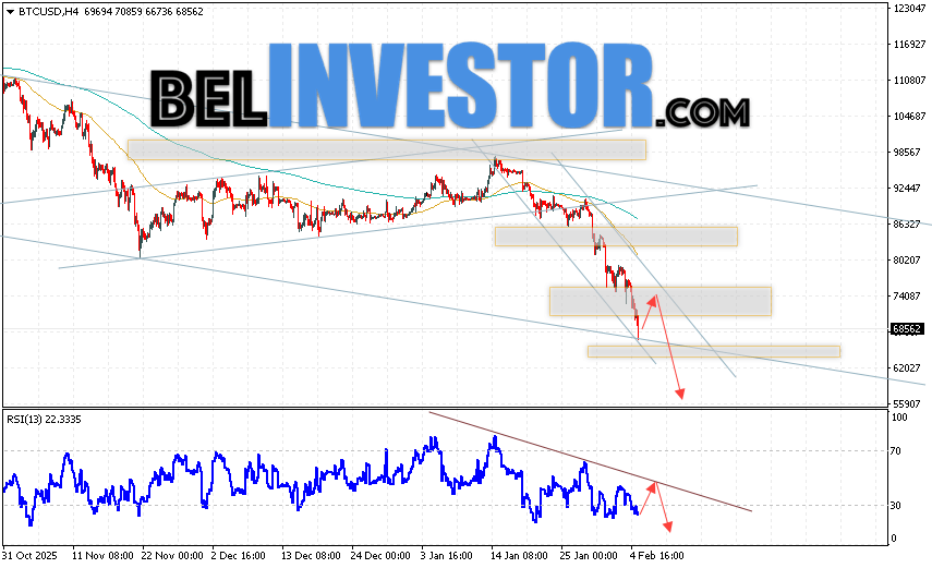 Котировки BTC/USD торгуются на уровне 68562 и продолжают движение в рамках развития падения и нисходящего канала. Скользящие средние указывают на наличие краткосрочной медвежьей тенденции по Bitcoin. Цены пробили область между сигнальными линиями вниз, что указывает на давление со стороны продавцов «Цифрового Золота» и потенциальное продолжение развития падения стоимости актива уже с текущих уровней. В рамках прогноза курса криптовалюты на завтра 6 февраля 2026 стоит ожидать попытку развития бычьей коррекции стоимости цифрового актива и тест уровня сопротивления вблизи области 74025. Откуда вновь стоит ожидать отскок вниз и попытку продолжения падения курса Bitcoin с целью ниже области 55865.