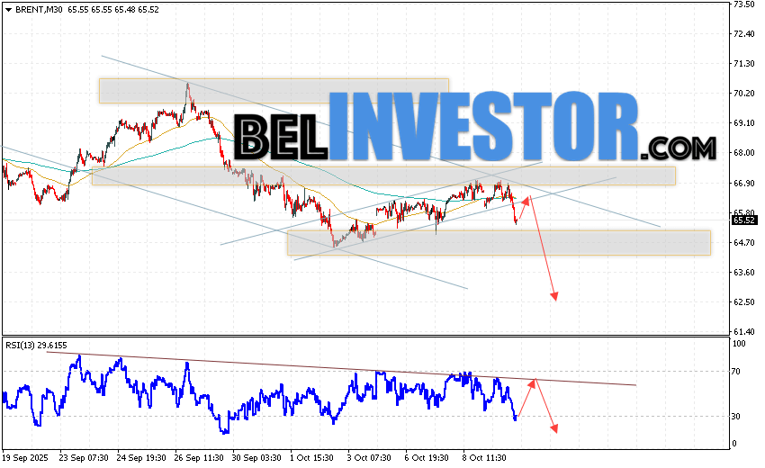 Нефть прогноз Brent на 10 октября 2025 предполагает попытку теста уровня сопротивления вблизи области 66.55. Далее, продолжение падения нефти с целью ниже уровня 62.55. В пользу снижения актива выступит тест линии тренда на индикаторе относительной силы. Отменой варианта падения цены нефти Brent станет сильный рост и пробой уровня 68.45. Это укажет на продолжение подъёма котировок в область выше уровня 73.75.