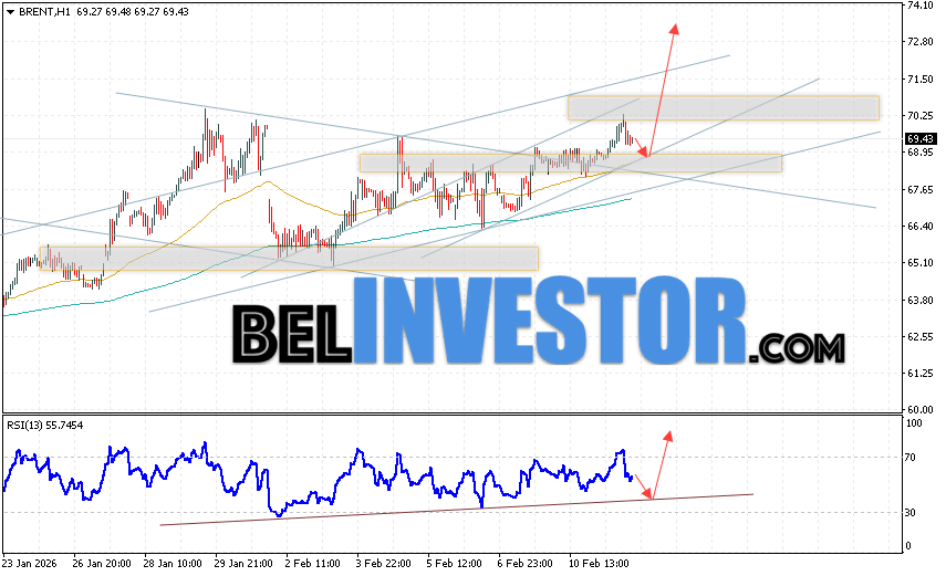Нефть прогноз Brent на 12 февраля 2026 предполагает попытку теста уровня поддержки вблизи области 68.65. Далее, продолжение роста нефти с целью выше уровня 72.85. В пользу подъёма актива выступит тест линии тренда на индикаторе относительной силы. Отменой варианта роста цены нефти Brent станет падение и пробой уровня 67.05. Это укажет на продолжение снижения котировок в область ниже уровня 62.25.