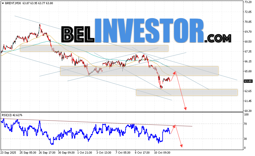 Нефть прогноз Brent на 14 октября 2025 предполагает попытку теста уровня сопротивления вблизи области 65.75. Далее, продолжение падения нефти с целью ниже уровня 60.35. В пользу снижения актива выступит тест линии тренда на индикаторе относительной силы. Отменой варианта падения цены нефти Brent станет сильный рост и пробой уровня 67.85. Это укажет на продолжение подъёма котировок в область выше уровня 74.05.