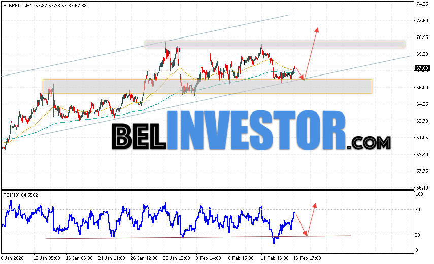 Нефть прогноз Brent на 17 февраля 2026 предполагает попытку теста уровня поддержки вблизи области 66.75. Далее, продолжение роста нефти с целью выше уровня 71.55. В пользу подъёма актива выступит тест линии тренда на индикаторе относительной силы. Отменой варианта роста цены нефти Brent станет падение и пробой уровня 65.35. Это укажет на продолжение снижения котировок в область ниже уровня 60.25.