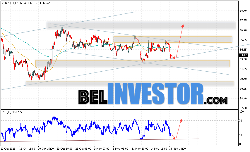 Нефть прогноз Brent на 20 ноября 2025 предполагает попытку теста уровня поддержки вблизи области 63.05. Далее, продолжение роста нефти с целью выше уровня 66.75. В пользу подъёма актива выступит тест линии тренда на индикаторе относительной силы. Отменой варианта роста цены нефти Brent станет падение и пробой уровня 60.35. Это укажет на продолжение падения котировок в область ниже уровня 56.65.