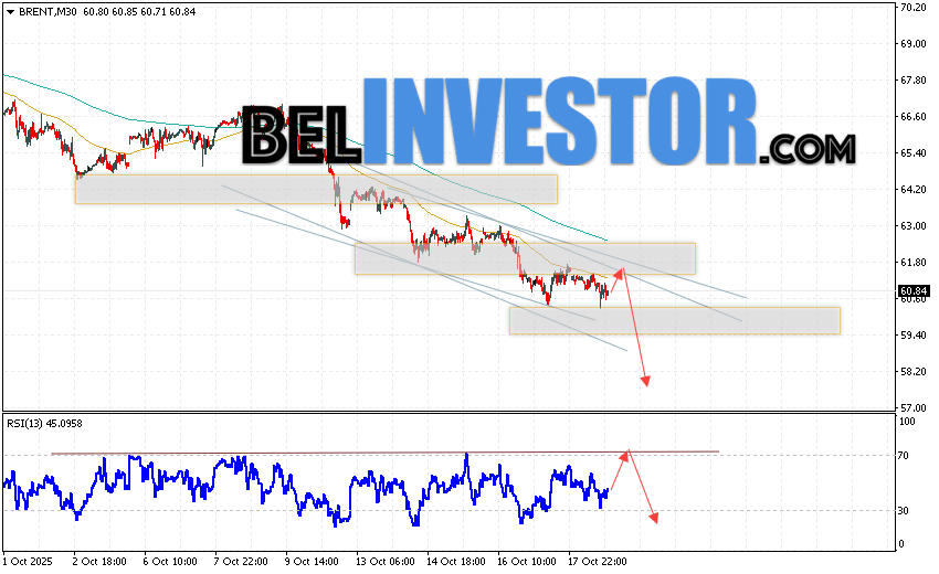 Нефть прогноз Brent на 21 октября 2025 предполагает попытку теста уровня сопротивления вблизи области 61.65. Далее, продолжение падения нефти с целью ниже уровня 57.65. В пользу снижения актива выступит тест линии тренда на индикаторе относительной силы. Отменой варианта падения цены нефти Brent станет сильный рост и пробой уровня 63.45. Это укажет на продолжение подъёма котировок в область выше уровня 70.65.