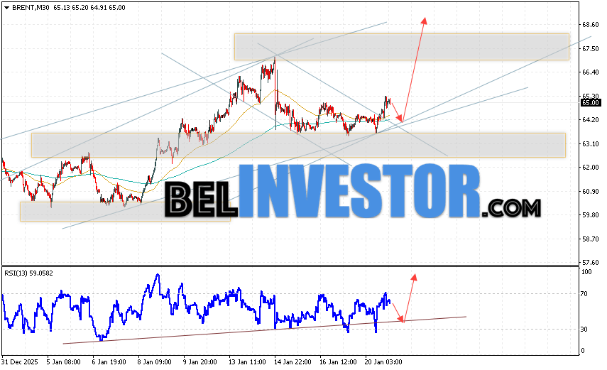 Нефть прогноз Brent на 21 января 2026 предполагает попытку теста уровня поддержки вблизи области 64.15. Далее, продолжение роста нефти с целью выше уровня 68.65. В пользу подъёма актива выступит тест линии тренда на индикаторе относительной силы. Отменой варианта роста цены нефти Brent станет падение и пробой уровня 62.05. Это укажет на продолжение снижения котировок в область ниже уровня 56.05.