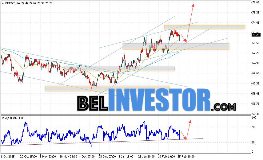 Нефть прогноз Brent на 27 февраля 2026 предполагает попытку теста уровня поддержки вблизи области 69.65. Далее, продолжение роста нефти с целью выше уровня 78.65. В пользу подъёма актива выступит тест линии тренда на индикаторе относительной силы. Отменой варианта роста цены нефти Brent станет падение и пробой уровня 65.65. Это укажет на продолжение снижения котировок в область ниже уровня 56.45.