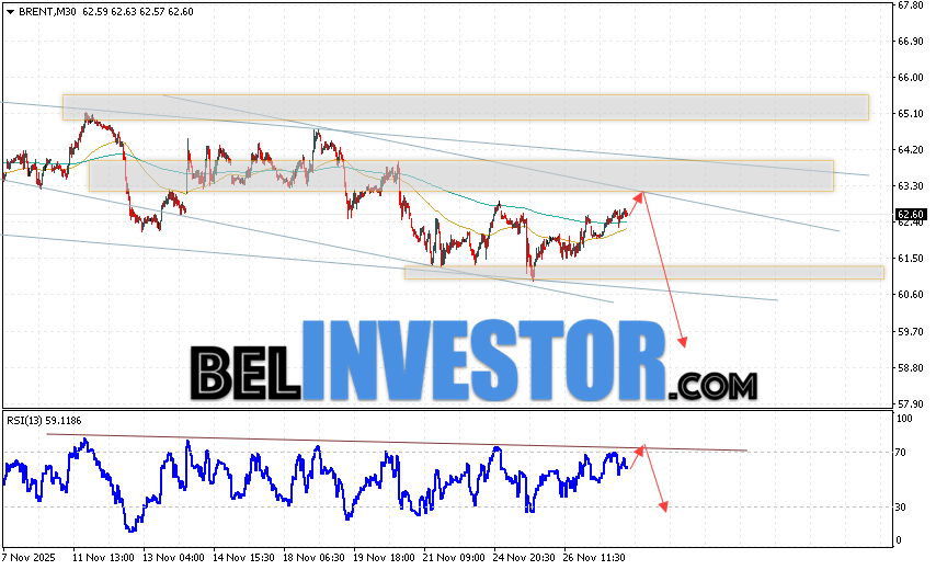 Нефть прогноз Brent на 28 ноября 2025 предполагает попытку теста уровня сопротивления вблизи области 63.05. Далее, продолжение падения нефти с целью ниже уровня 59.25. В пользу падения актива выступит тест линии тренда на индикаторе относительной силы. Отменой варианта падения цены нефти Brent станет сильный рост и пробой уровня 65.05. Это укажет на продолжение подъёма котировок в область выше уровня 72.45.