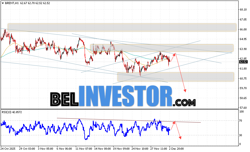 Нефть прогноз Brent на 3 декабря 2025 предполагает попытку теста уровня сопротивления вблизи области 63.05. Далее, продолжение падения нефти с целью ниже уровня 59.45. В пользу падения актива выступит тест линии тренда на индикаторе относительной силы. Отменой варианта падения цены нефти Brent станет сильный рост и пробой уровня 65.05. Это укажет на продолжение подъёма котировок в область выше уровня 72.55.