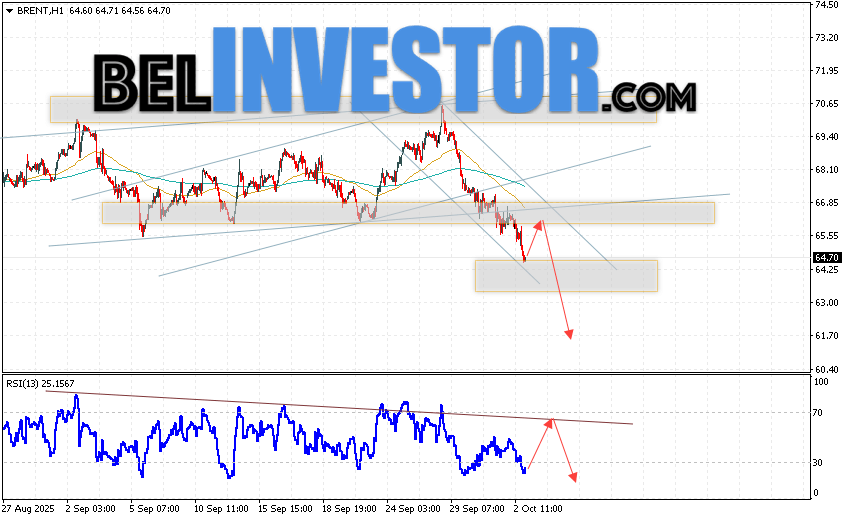 Нефть прогноз Brent на 3 октября 2025 предполагает попытку теста уровня сопротивления вблизи области 65.85. Далее, продолжение падения нефти с целью ниже уровня 61.65. В пользу снижения актива выступит тест линии тренда на индикаторе относительной силы. Отменой варианта падения цены нефти Brent станет сильный рост и пробой уровня 68.25. Это укажет на продолжение подъёма котировок в область выше уровня 75.05.
