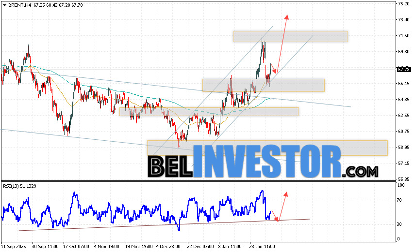 Нефть прогноз Brent на 4 февраля 2026 предполагает попытку теста уровня поддержки вблизи области 66.65. Далее, продолжение роста нефти с целью выше уровня 73.65. В пользу подъёма актива выступит тест линии тренда на индикаторе относительной силы. Отменой варианта роста цены нефти Brent станет падение и пробой уровня 64.25. Это укажет на продолжение снижения котировок в область ниже уровня 56.95.
