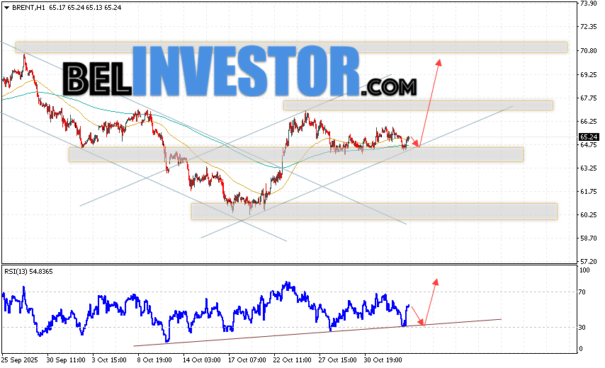 Нефть прогноз Brent на 5 ноября 2025 предполагает попытку теста уровня поддержки вблизи области 64.65. Далее, продолжение роста нефти с целью выше уровня 70.05. В пользу подъёма актива выступит тест линии тренда на индикаторе относительной силы. Отменой варианта роста цены нефти Brent станет падение и пробой уровня 62.05. Это укажет на продолжение падения котировок в область ниже уровня 56.65.