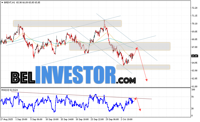 Нефть прогноз Brent на 7 октября 2025 предполагает попытку теста уровня сопротивления вблизи области 66.85. Далее, продолжение падения нефти с целью ниже уровня 62.45. В пользу снижения актива выступит тест линии тренда на индикаторе относительной силы. Отменой варианта падения цены нефти Brent станет сильный рост и пробой уровня 68.65. Это укажет на продолжение подъёма котировок в область выше уровня 75.05.
