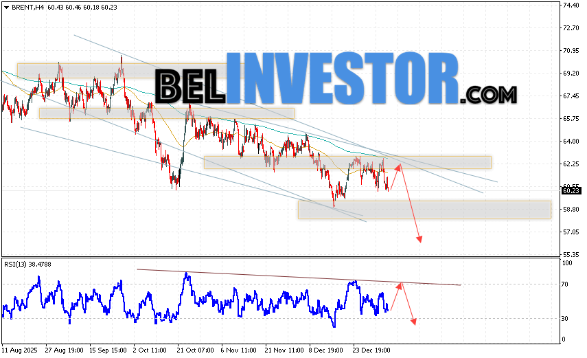 Нефть прогноз Brent на 8 января 2026 предполагает попытку теста уровня сопротивления вблизи области 62.05. Далее, продолжение падения нефти с целью ниже уровня 56.45. В пользу снижения актива выступит тест линии тренда на индикаторе относительной силы. Отменой варианта падения цены нефти Brent станет сильный рост и пробой уровня 65.35. Это укажет на продолжение роста котировок в область выше уровня 72.05.