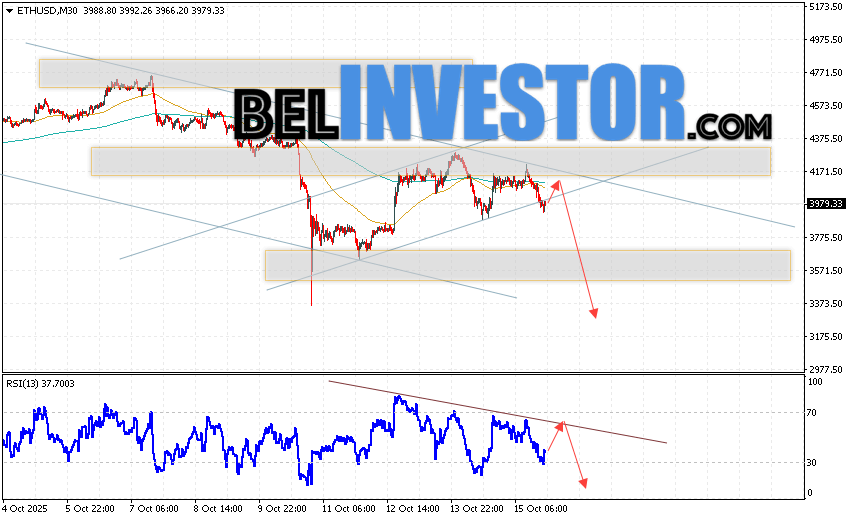 ETH/USD прогноз Ethereum на 16 октября 2025 предполагает попытку бычьей коррекции и тест области сопротивления вблизи уровня 4025. Откуда стоит ожидать отскок и продолжения падения криптовалюты ETH/USD в область ниже уровня 3355. Дополнительным сигналом в пользу снижения Ethereum выступит тест линии тренда на индикаторе относительной силы. Отменой варианта падения цифровой валюты станет пробой области поддержки 4405. Что укажет на продолжение подъёма цифровой валюты с потенциальной целью выше уровня 5165.