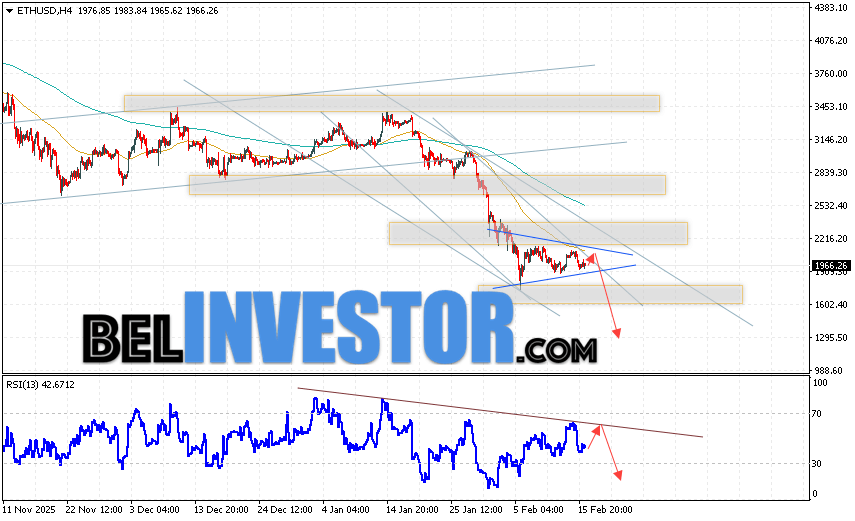 ETH/USD прогноз Ethereum на 17 февраля 2026 предполагает попытку бычьей коррекции и тест области сопротивления вблизи уровня 1985. Откуда стоит ожидать отскок и продолжения падения криптовалюты ETH/USD в область ниже уровня 1295. Дополнительным сигналом в пользу снижения Ethereum выступит тест линии тренда на индикаторе относительной силы. Отменой варианта падения цифровой валюты станет пробой области сопротивления 2265. Что укажет на продолжение подъёма цифровой валюты с потенциальной целью выше уровня 2775.