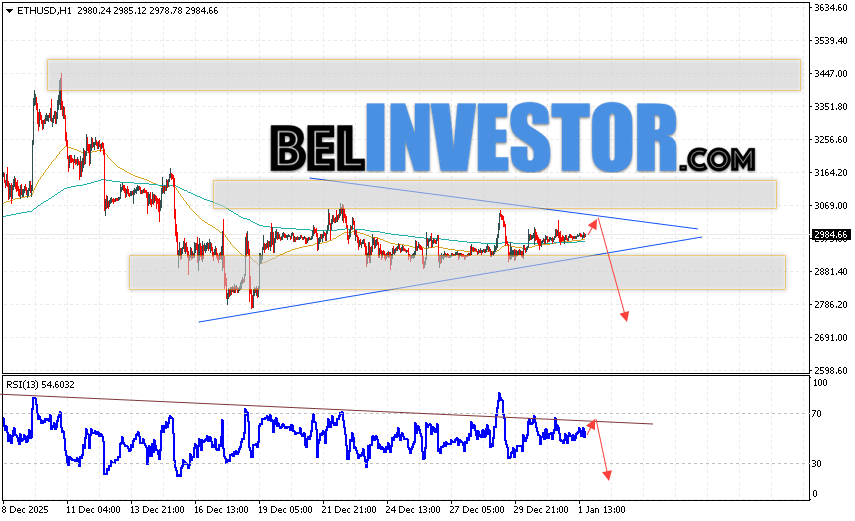 ETH/USD прогноз Ethereum на 2 января 2026 предполагает попытку бычьей коррекции и тест области сопротивления вблизи уровня 3005. Откуда стоит ожидать отскок и продолжения роста криптовалюты ETH/USD в область ниже уровня 2765. Дополнительным сигналом в пользу падения Ethereum выступит тест линии тренда на индикаторе относительной силы. Отменой варианта падения цифровой валюты станет пробой области сопротивления 3145. Что укажет на продолжение роста цифровой валюты с потенциальной целью выше уровня 3435.