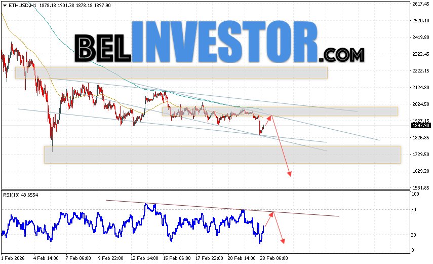 ETH/USD прогноз Ethereum на 24 февраля 2026 предполагает попытку бычьей коррекции и тест области сопротивления вблизи уровня 1945. Откуда стоит ожидать отскок и продолжения падения криптовалюты ETH/USD в область ниже уровня 1625. Дополнительным сигналом в пользу снижения Ethereum выступит тест линии тренда на индикаторе относительной силы. Отменой варианта падения цифровой валюты станет пробой области сопротивления 2175. Что укажет на продолжение подъёма цифровой валюты с потенциальной целью выше уровня 2665.