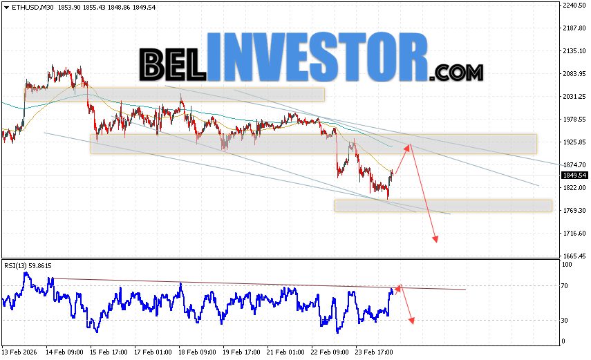ETH/USD прогноз Ethereum на 25 февраля 2026 предполагает попытку бычьей коррекции и тест области сопротивления вблизи уровня 1925. Откуда стоит ожидать отскок и продолжения падения криптовалюты ETH/USD в область ниже уровня 1645. Дополнительным сигналом в пользу снижения Ethereum выступит тест линии тренда на индикаторе относительной силы. Отменой варианта падения цифровой валюты станет пробой области сопротивления 2055. Что укажет на продолжение подъёма цифровой валюты с потенциальной целью выше уровня 2665.