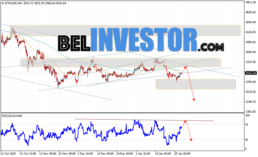ETH/USD прогноз Ethereum на 29 января 2026 предполагает попытку бычьей коррекции и тест области сопротивления вблизи уровня 3075. Откуда стоит ожидать отскок и продолжения падения криптовалюты ETH/USD в область ниже уровня 2245. Дополнительным сигналом в пользу снижения Ethereum выступит тест линии тренда на индикаторе относительной силы. Отменой варианта падения цифровой валюты станет пробой области сопротивления 3375. Что укажет на продолжение подъёма цифровой валюты с потенциальной целью выше уровня 3835.
