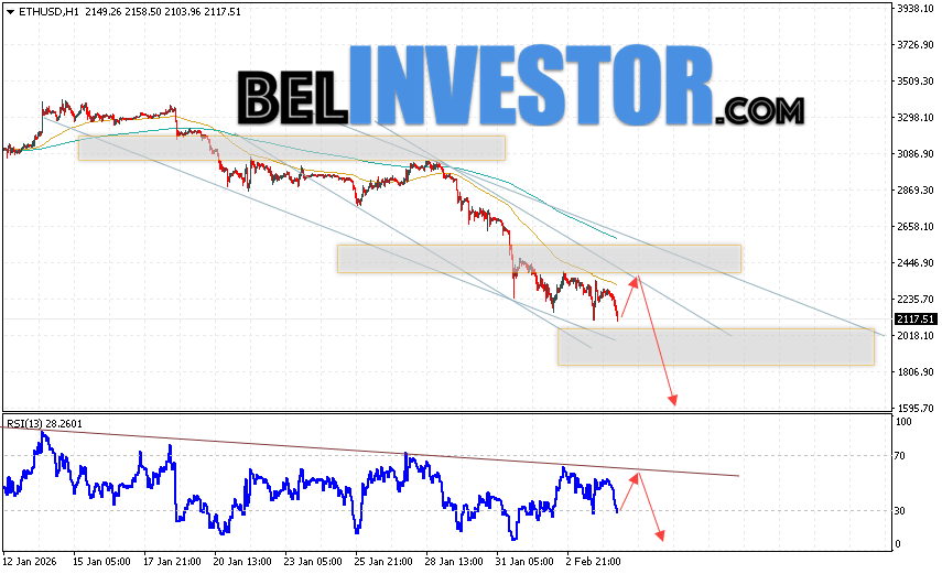 ETH/USD прогноз Ethereum на 5 февраля 2026 предполагает попытку бычьей коррекции и тест области сопротивления вблизи уровня 2265. Откуда стоит ожидать отскок и продолжения падения криптовалюты ETH/USD в область ниже уровня 1585. Дополнительным сигналом в пользу снижения Ethereum выступит тест линии тренда на индикаторе относительной силы. Отменой варианта падения цифровой валюты станет пробой области сопротивления 2775. Что укажет на продолжение подъёма цифровой валюты с потенциальной целью выше уровня 3385.