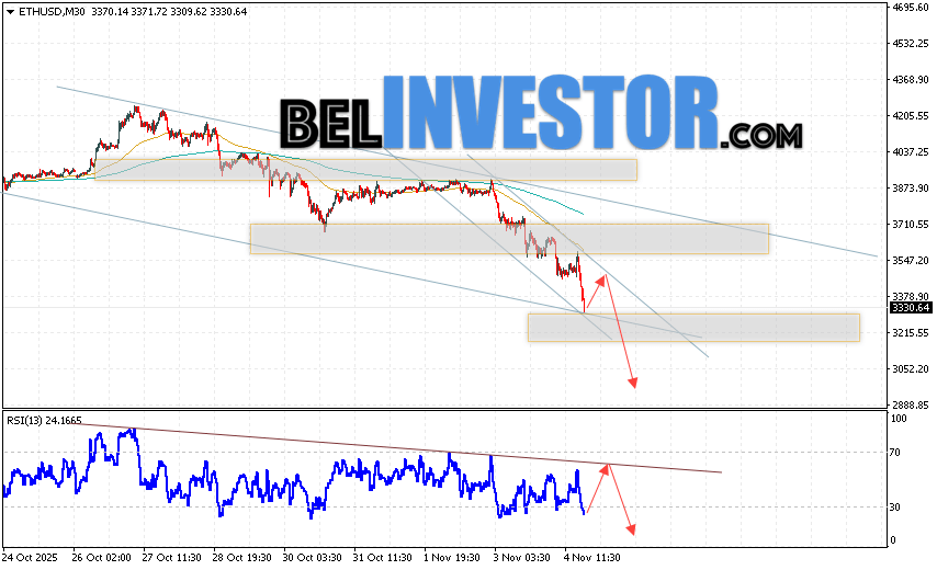 ETH/USD прогноз Ethereum на 5 ноября 2025 предполагает попытку бычьей коррекции и тест области сопротивления вблизи уровня 3425. Откуда стоит ожидать отскок и продолжения роста криптовалюты ETH/USD в область ниже уровня 2945. Дополнительным сигналом в пользу падения Ethereum выступит тест линии тренда на индикаторе относительной силы. Отменой варианта падения цифровой валюты станет пробой области сопротивления 3775. Что укажет на продолжение роста цифровой валюты с потенциальной целью выше уровня 4245.