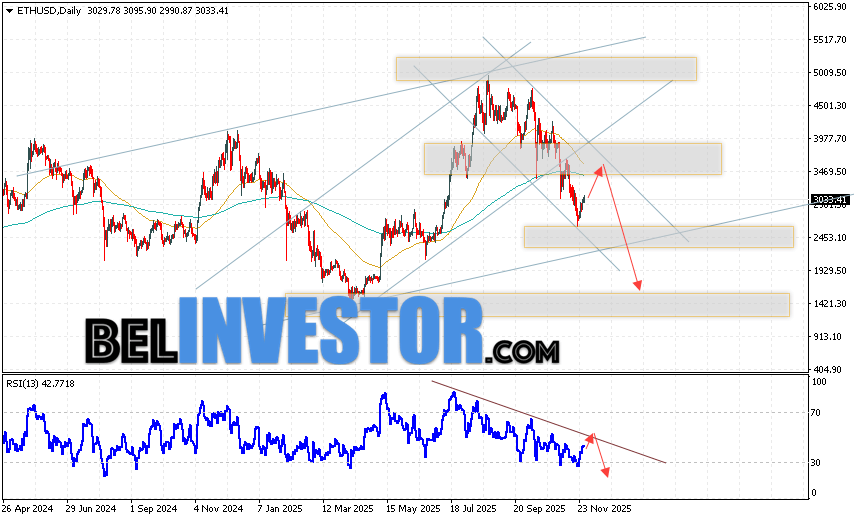 Дополнительным сигналом в пользу падения котировок ETH/USD на текущей торговой неделе 1 — 5 декабря 2025 выступит тест линии сопротивления на индикаторе относительной силы. Вторым сигналом станет отскок от верхней границы медвежьей канала. Отменой варианта падения стоимости криптовалюты на текущей торговой неделе станет сильный рост и пробой уровня 3965. Это укажет на пробой области сопротивления и продолжение роста котировок ETH/USD с потенциальной целью выше уровня 4525. Подтверждением падению криптовалюты Ethereum выступит пробой области поддержки и закрытие котировок ниже уровня 2385.