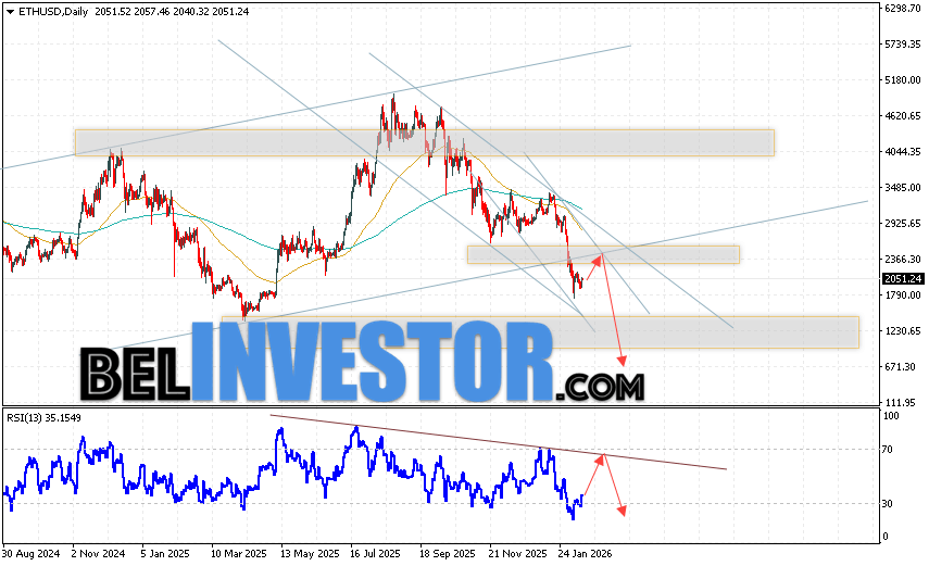 Дополнительным сигналом в пользу падения котировок ETH/USD на текущей торговой неделе 16 — 20 февраля 2026 выступит тест линии сопротивления на индикаторе относительной силы. Вторым сигналом станет отскок от верхней границы нисходящего канала. Отменой варианта падения стоимости криптовалюты на текущей торговой неделе станет сильный рост и пробой уровня 2965. Это укажет на пробой области сопротивления и продолжение роста котировок ETH/USD с потенциальной целью выше уровня 3855. Подтверждением падению криптовалюты Ethereum выступит пробой области поддержки и закрытие котировок ниже уровня 1695.