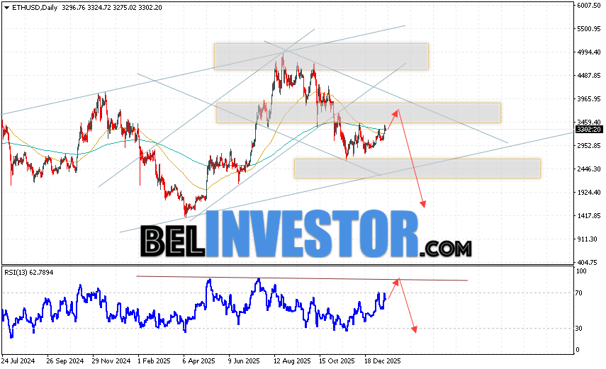 Ethereum прогноз ETH/USD на неделю 19 — 23 января 2026 предполагает попытку развития бычьей коррекции и теста области сопротивления вблизи уровня 3505. Откуда стоит ожидать отскок вниз и продолжения падения криптовалюты в область ниже уровня 1845. Дополнительным сигналом в пользу снижения курса Ethereum выступит тест линии тренда на индикаторе относительной силы. Отменой варианта падения станет сильный рост и пробой области 4065. В этом случае стоит ожидать продолжение подъёма c целью выше области 4465.