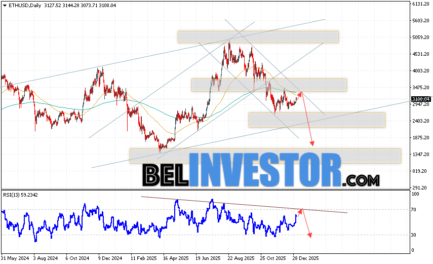 Ethereum прогноз ETH/USD на неделю 5 — 9 января 2026 предполагает попытку развития бычьей коррекции и теста области сопротивления вблизи уровня 3205. Откуда стоит ожидать отскок вниз и продолжения падения криптовалюты в область ниже уровня 1745. Дополнительным сигналом в пользу снижения курса Ethereum выступит тест линии тренда на индикаторе относительной силы. Отменой варианта падения станет сильный рост и пробой области 3685. В этом случае стоит ожидать продолжение подъёма c целью выше области 4165.
